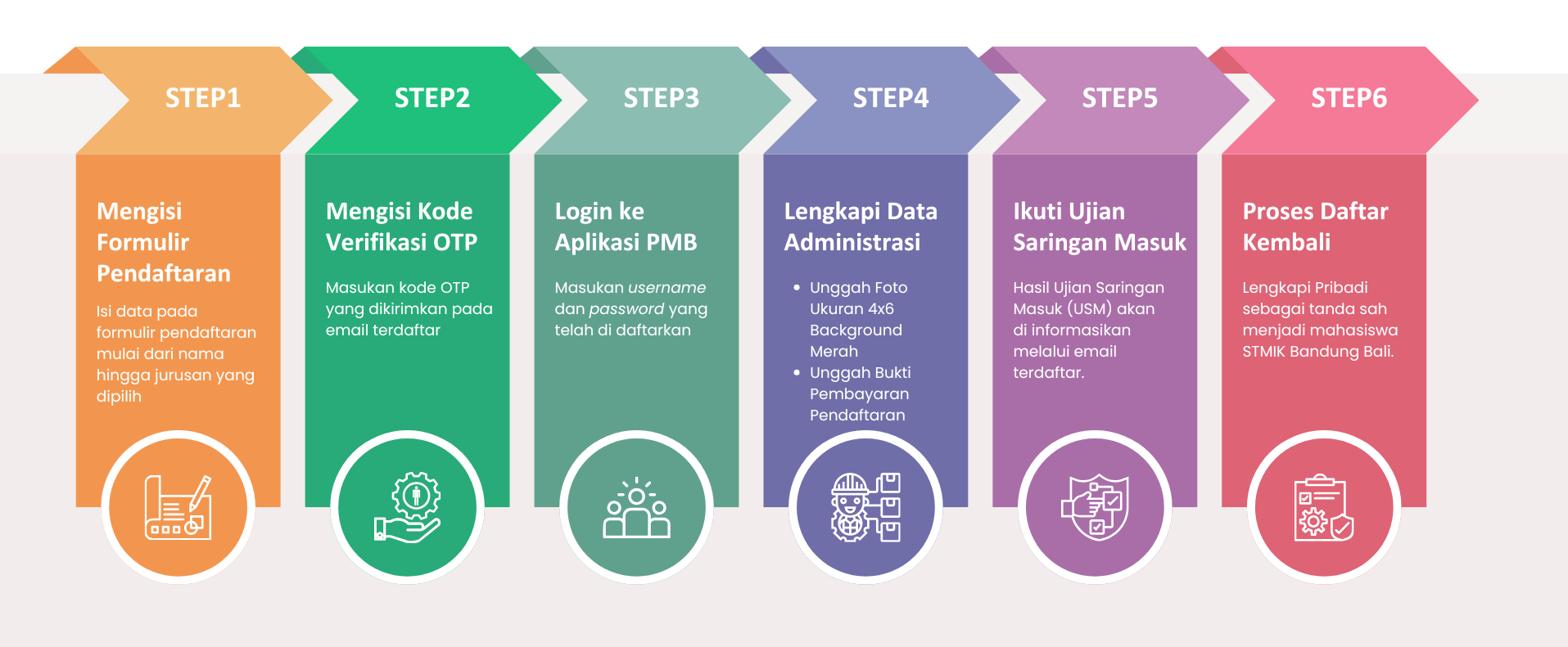 Langkah mudah bergabung dengan STMIK Bandung Bali. Pelajari alur pendaftaran mulai dari pengajuan akun hingga resmi menjadi mahasiswa baru di bawah ini.